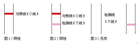 1、阴性:测试区中出现一条紫红色线(对照线C线),表明未怀孕。