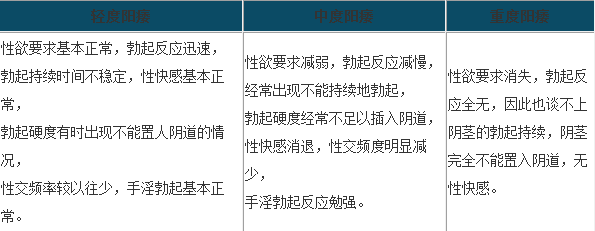 3、中度阳痿:性欲要求减弱;刺激性敏感区出现阴茎勃起减慢;接受异性性刺激,阴茎不能立即作出勃起反应,或勉强作出勃起反应;房事时阴茎经常不能勃起或经常出现勃起不能持续的情况,阴茎在房事时不能经常顺利地置人阴道,勃起角度达不到90°,且硬度极差;性交频率明显减少;性快感显着退减。
